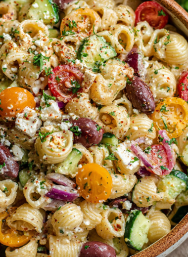 Vibrant and refreshing, this Greek Pasta Salad combines crisp vegetables, tangy feta, and olives for a delightful dish ideal for picnics or summer gatherings.