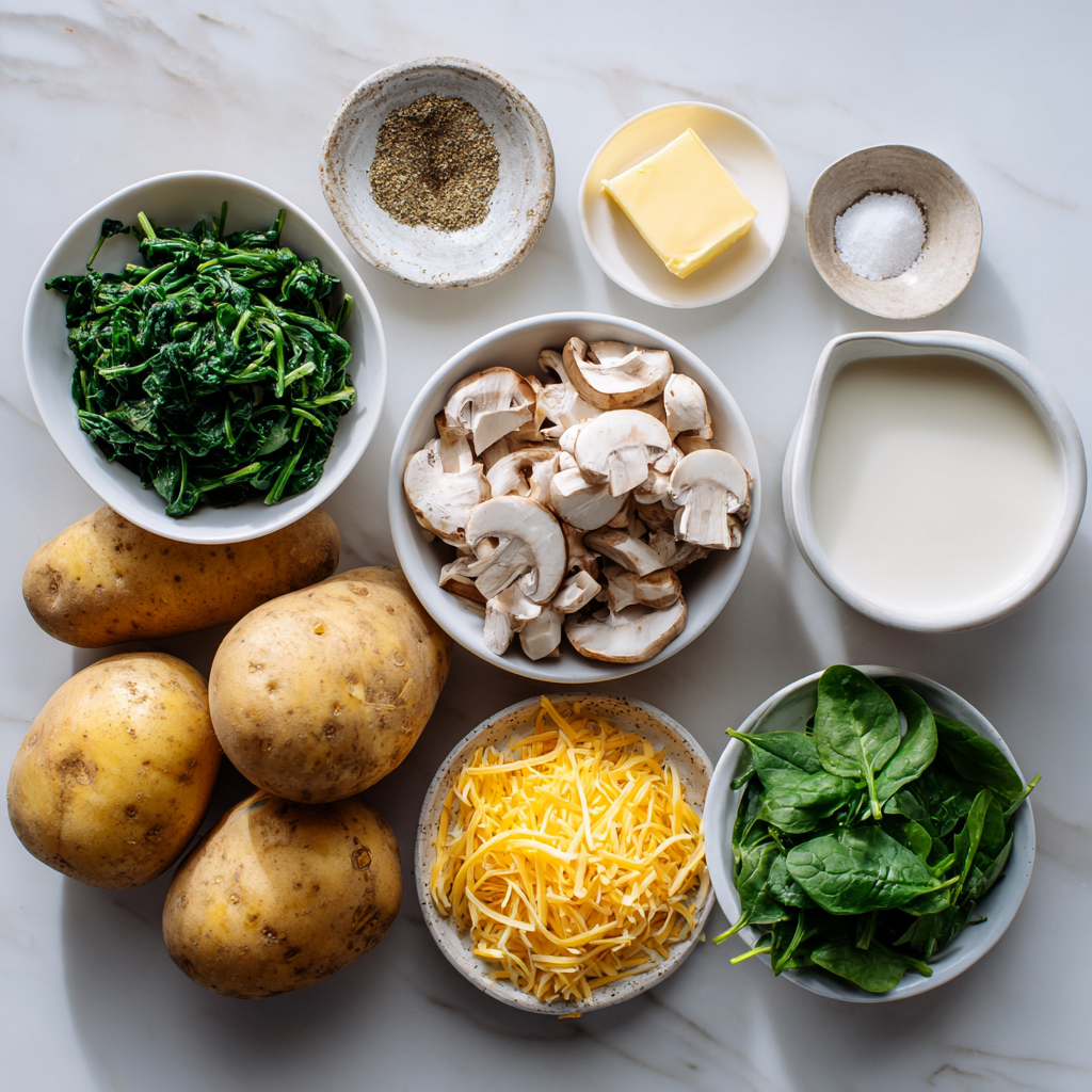Ingredients for Baked Potatoes with Spinach, Cheese, and Mushrooms