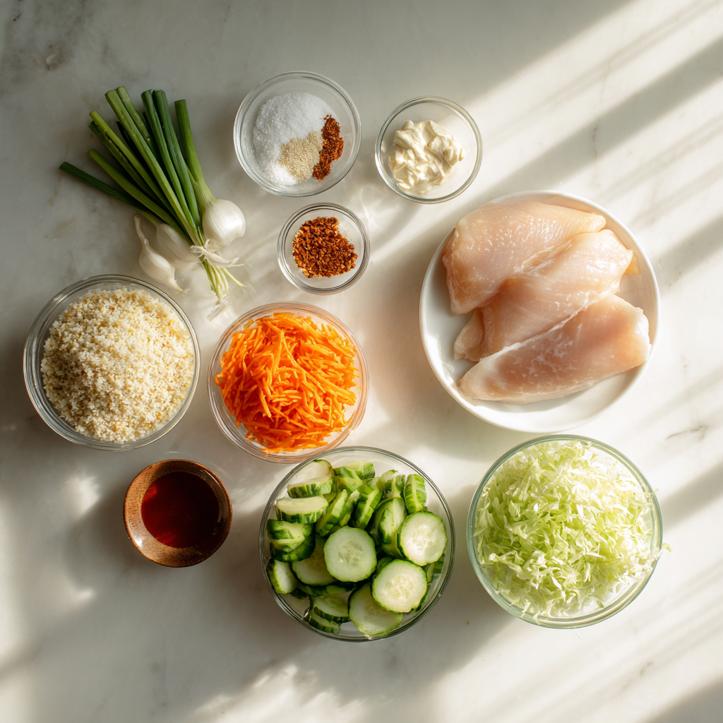 - Assemble bowls: Add rice as the base, then top with lettuce/cabbage, carrots, cucumber, and crispy chicken.