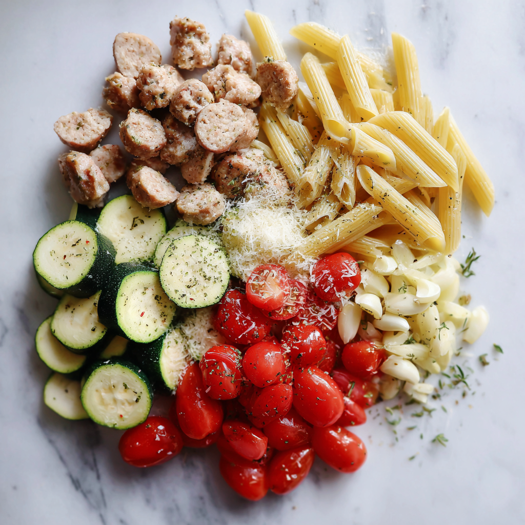 Ingredients for Chicken Sausages with Zucchini, Tomatoes, and Pasta