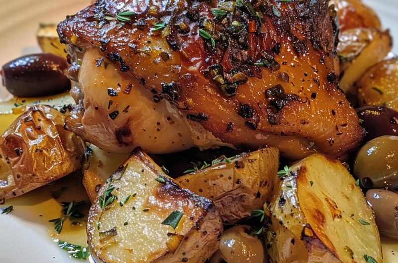 Experience the vibrant flavors of the Crispy Mediterranean Chicken Thighs with Roasted Lemon-Garlic Potatoes & Olives: One-Pan Dinner. This dish encapsulates the essence of Mediterranean cuisine, harmoniously blending savory, tangy notes with aromatic herbs. The star of this recipe, the chicken thighs, are marinated to perfection, ensuring a juicy, tender bite, while the skin crisps up beautifully for that satisfying crunch.