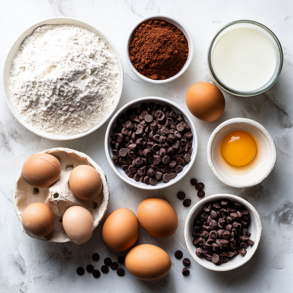 - In a large bowl, whisk together the dry ingredients: flour, cocoa powder, sugar, baking powder, baking soda, and salt.