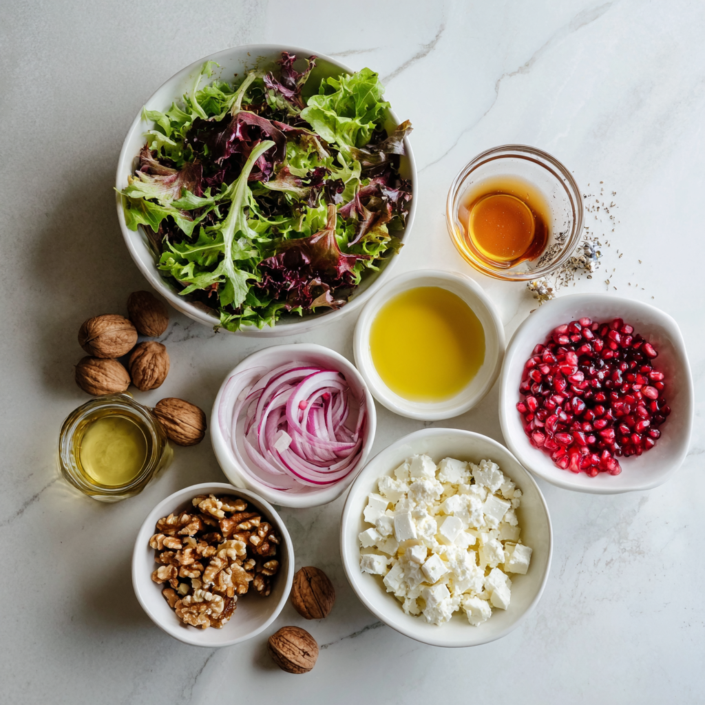 In a large mixing bowl, combine the washed salad greens, pomegranate seeds, chopped walnuts, crumbled feta cheese, and sliced red onion. Stir gently to combine while being careful not to bruise the greens. This step ensures every bite has a bit of everything, and the ingredients mix well without losing their individual characteristics.