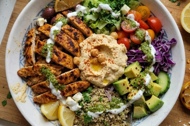 - Assemble the Bowls: In each serving bowl, place a generous scoop of quinoa or rice as the base. Top with sliced grilled chicken, chopped vegetables, and a dollop of hummus. Drizzle with your homemade dressing and garnish with Kalamata olives and feta cheese. Serve immediately.