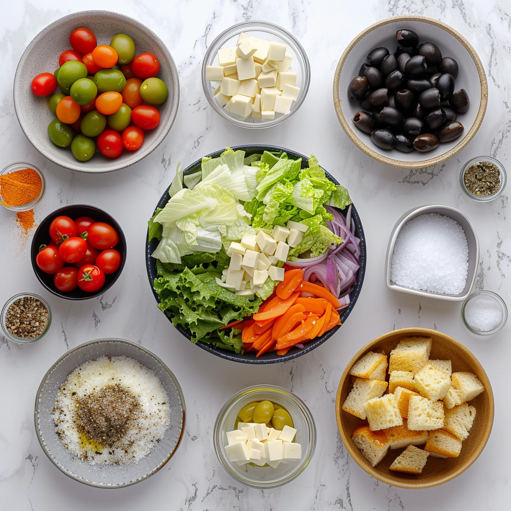 Here are the ingredients you’ll need for the classic version of the Olive Garden Salad. These quantities serve about 4 people: