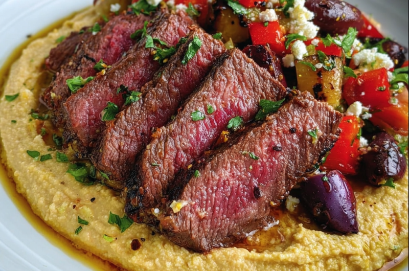 Tender, perfectly seared steak over creamy hummus and fluffy quinoa with crisp vegetables — a complete Mediterranean feast in one bowl, ready in 30 minutes.