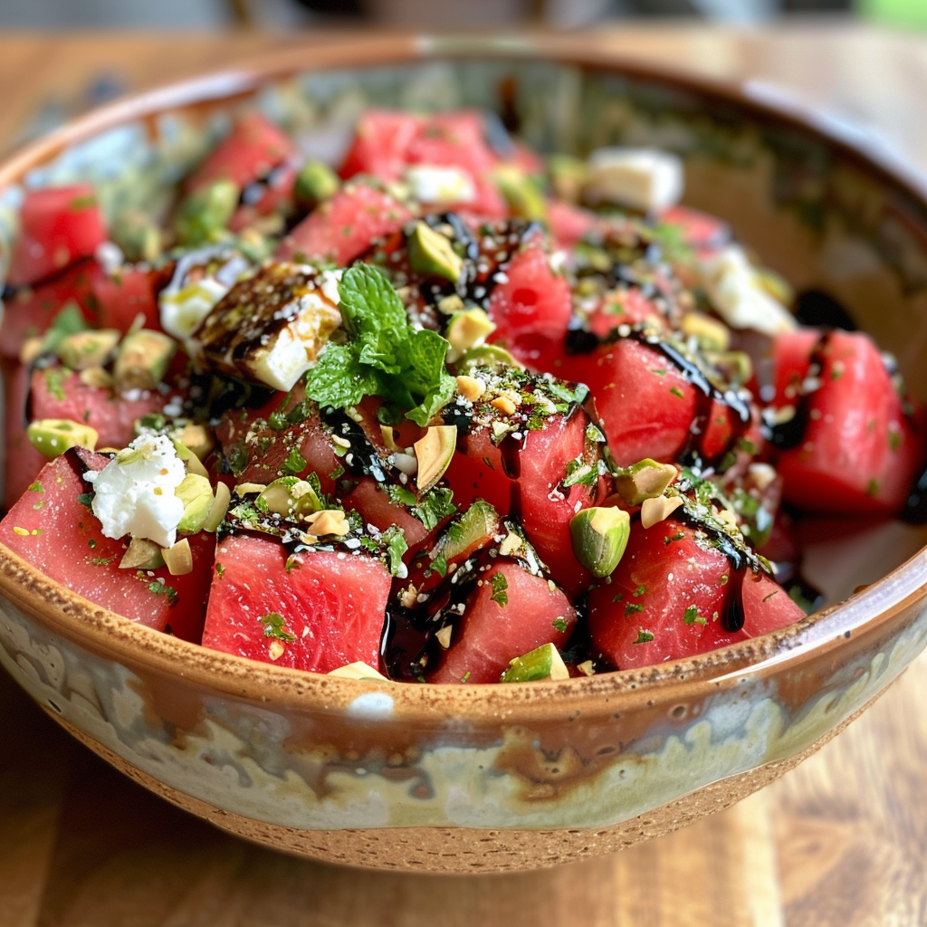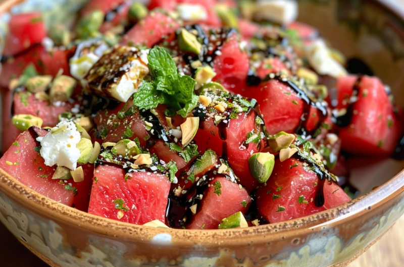 It’s the contrast that gets you. One minute you’re hitting the hydrating, sweet crunch of cold watermelon, and the next, you’re navigating the creamy, saline punch of feta. This Refreshing Watermelon Feta Mint Salad with Balsamic Glaze and Pistachios isn’t just a side dish; it’s a masterclass in balancing the five tastes. While the combination might seem trendy, it relies on ancient principles of food pairing—sweet and salty are biological friends. I’ve spent summers testing variations of this salad, and this version, with the earthy crunch of pistachios and a sticky balsamic finish, is the one that disappears fastest at potlucks. It’s simple, yes, but the details matter.